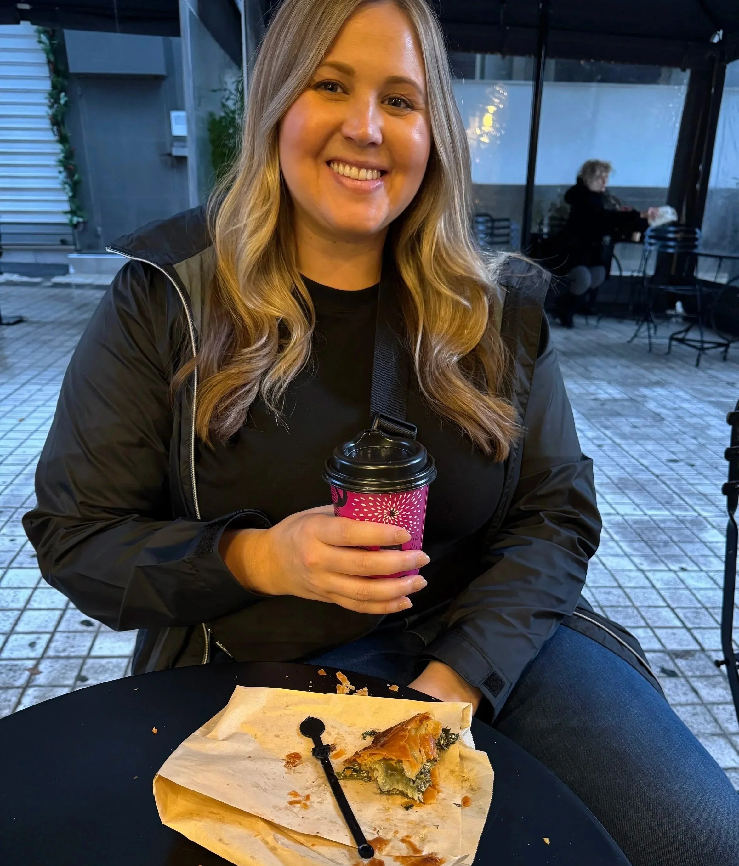 I love to travel and want to hear about all the places you’ve been and where you’re going next (the right is me eating spanakopita in Greece).