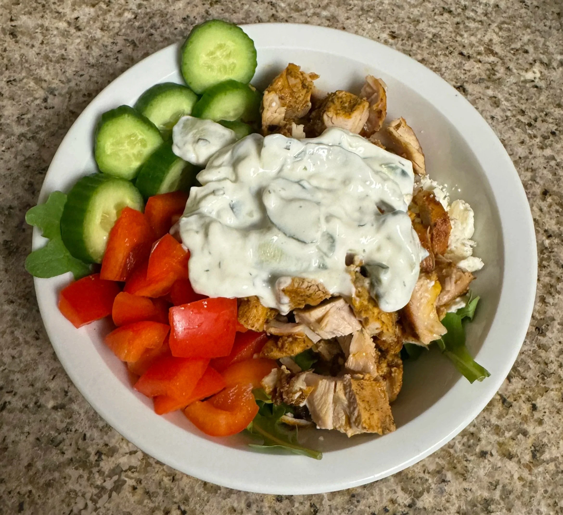 5. Assemble bowl: Put rice at the bottom of the bowl, add chicken, cucumber, and bell peppers. Top with tzatziki and sprinkle feta.